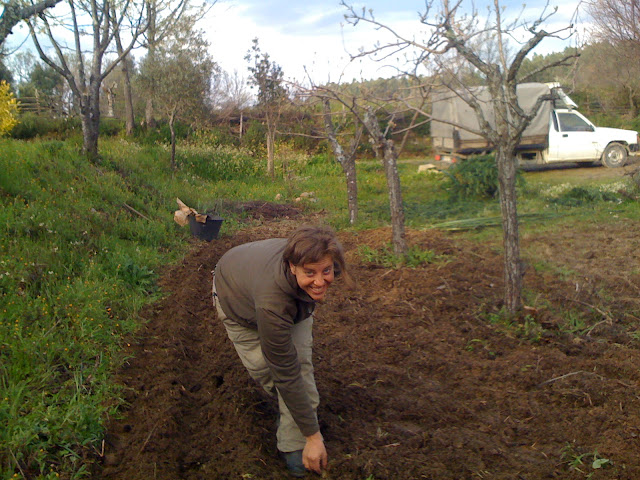 While they were here Barbara and Ivan made a shelter near the pond with mimosa and broom as a shady place to relax after a swim. Below, Katie and I worked on making beds for the 3 sisters - corn, beans and pumpkin. We planted and then wove a fence to protect the beds from the roaming chickens - Maria in particular.