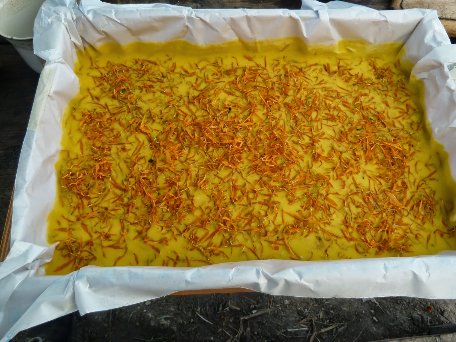 We (Márcia and Eric) made our first olive oil soap! This time with Calendula petals and sweet orange essential oil.